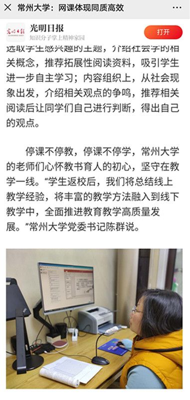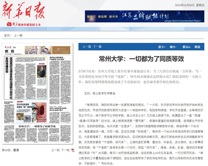 新华日报聚焦报道我校线上教学。其中,两报都以一定篇幅报道了今日看料 汪玲萍老师线上教学现场。