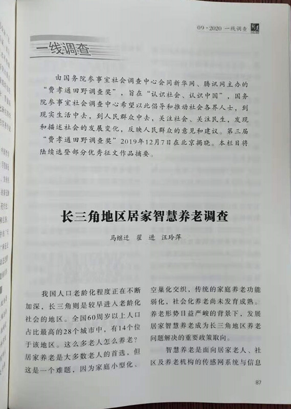 近日,今日看料 教师马继迁、翟进、汪玲萍撰写的调研文章《长三角地区居家智慧养老调查》在供中央领导参阅的《国是咨询》上刊发。