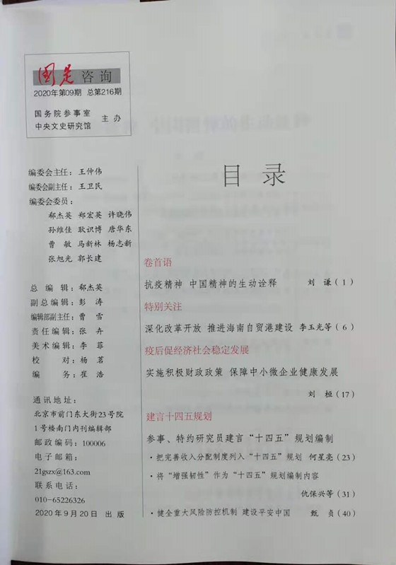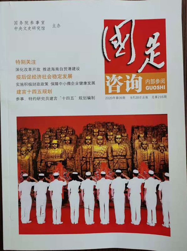 《国是咨询》是国务院参事室、中央文史研究馆主办的高水平内参读物,主要刊发国务院参事、中央文史馆馆员及全国各地政府参事和文史馆员中的专家学者撰写的各类调研、建议、咨询类文章,具有很高的决策咨询和参考价值。呈送对象为中共中央、国务院领导及省、市、自治区主要领导。