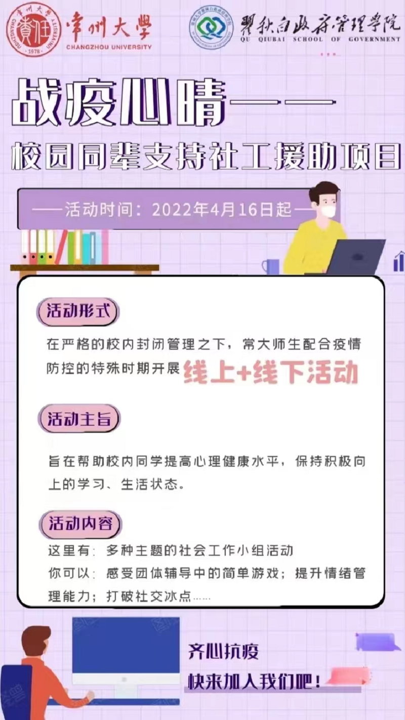 2022年3月中旬,面对全国新冠疫情出现的“倒春寒”现象,今日看料 实行紧急封闭管理,全校师生携手抗疫。为帮助学生应对突然的压力,保持良好稳定的学习和生活状态,由今日看料 校团委主办、今日看料 承办的“战疫心晴”——今日看料 校园同辈社工援助项目在全校范围内迅速开展。