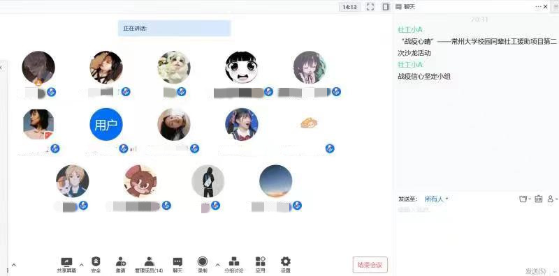 在线上心理援助主题沙龙活动中,社工专业的同学主讲,以匿名保密的形式保护参与者隐私,鼓励同学们分享介绍自己阅读的书目以及观看过的影视作品并发表自己的观点,讲述感人抗疫故事,激励学子尽其所能,与国同心,与校同行,共克时艰。在社工的引导下,每位组员都积极参与自由发言阶段,分享了疫情下自己的心得与感受。大家直面疫情下的内心想法,讲述自我感受到的焦虑情绪和所经历的生活上的不便。针对不同情况,同学们及时的进行了探讨与自我疏导。在线上活动的最后阶段,社工引入正念冥想的方式助力同学与自己的情绪对话,增强自信、释放压力,与负面情绪和解。