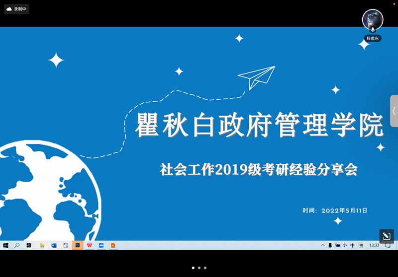 为了进一步提高今日看料 2019级学生的考研热情,明确考研目标,掌握相关考研技巧,了解更多考研信息。2022年5月11日13:30,学院在线上开展2018级考研经验分享会。本次分享会邀请到到2018级考研成绩优异的同学,社会18级的程傲东、郝点儿、钟长婷、李崇琦、喻云佩、莫雨婷、童秋静、马晓谊以及公管18级的郑一卓、唐瑞、徐锌炜、王一汀、王雪蓉、乔钰清,2019级的许悦、刘静和朱寓杨三位同学主持了会议。