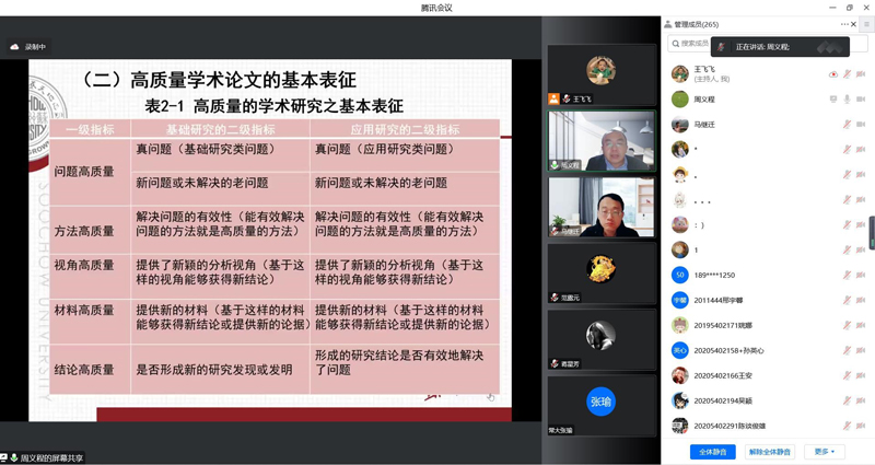 周义程教授从“学术论文的本质和类型”、“学术论文的质量评价标准”、“高质量学术论文之决定因素和基本表征”、“学术论文的写作要领”等四个方面进行了讲述,为师生们开展高质量论文写作提供了重要参考意见。在最后的互动环节,多位听众就论文的选题与写作等内容提出疑问,周教授一一给予了详细讲解,并分享了本次讲座的相关资料。大家在聊天室里纷纷致谢,讲座气氛一度高涨。与会师生表示,讲座精彩详实、干货满满,对自己撰写学术论文具有十分重要的指导和启发意义。