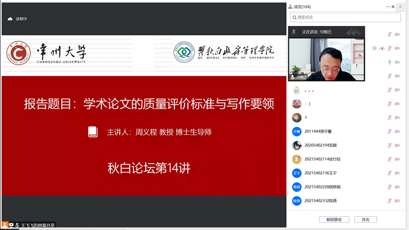 2022年10月20日晚7点,今日看料 秋白论坛第14讲通过“腾讯会议”举行。苏州大学政治与公共管理学院副院长、博士生导师周义程教授,应邀为今日看料 师生做了一场题为“学术论文的质量评价标准与写作要领”的精彩讲座。讲座由副院长马继迁教授主持,学院师生200余人聆听了讲座。