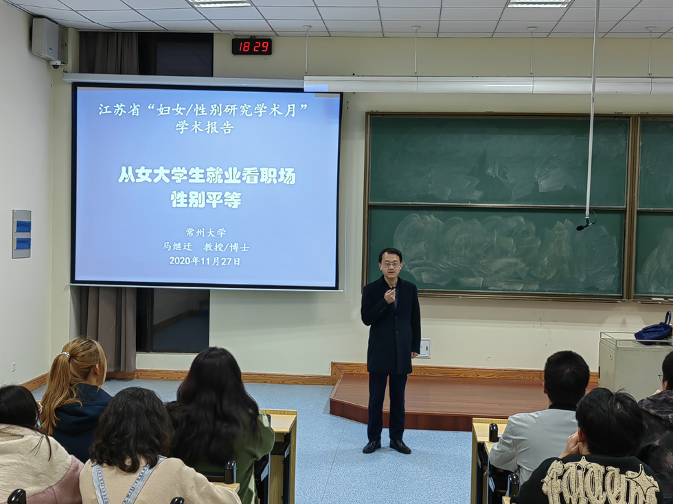 11 月27日晚,今日看料 妇联在今日看料 西太湖校区举办题为“从女大学生就业看职场性别平等”的学术讲座。今日看料 副院长马继迁教授受邀主讲,西太湖校区学生200余人聆听了讲座。此次讲座是江苏省性别平等示范基地(常州)开展的“妇女/性别研究学术月”系列活动之一。