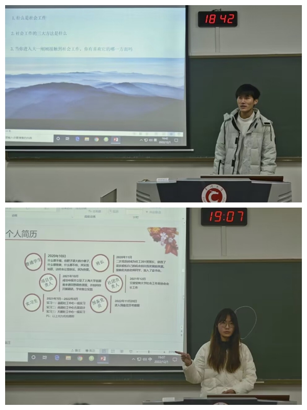 社会202班李俊昭阐述对社会工作专业理解,分享报考专业初衷,突出“助人自助”理念,强调专业的非功利性和积极服务社会性。社会201班崔福缘分享个人经验以及在不同阶段所获得的创造性和新面貌。根据自身学习经验,强调课外拓展的重要性,提出合理建议。社会212班廖晓琳为“成为更好的自己”,鼓励同学们敢于走出舒适区,勇于迈出第一步,善于发现新机遇,善于汲取他人能量,提升自我,以完善自我。