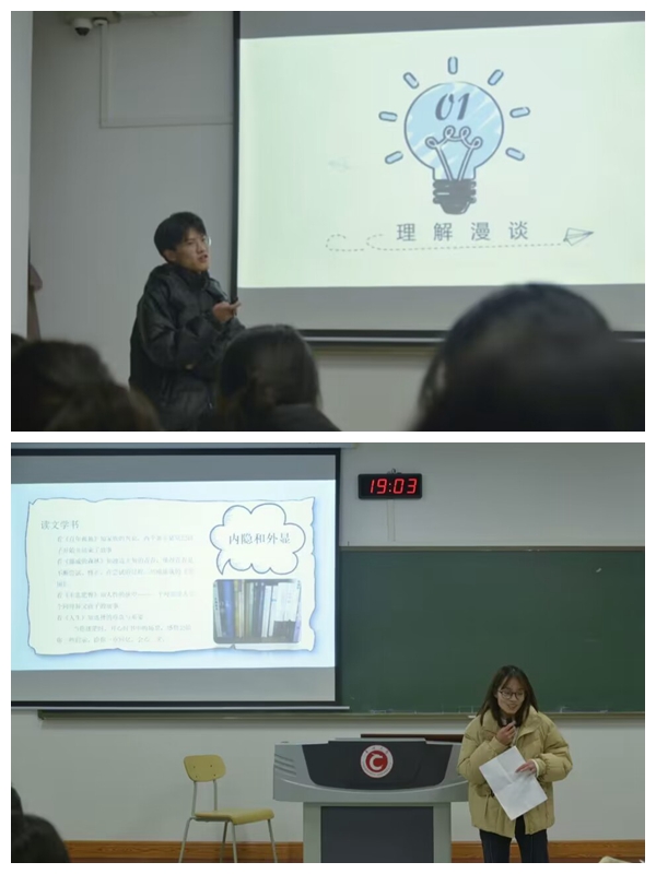 公管202班赵磊磊指出,要活在当下,勇于尝试的态度缓解迷茫与焦虑带来的精神内耗,以大学精神的三个维度引领我们追求真理,发展学问;公管202班罗小飘倡导要以读好书为本,制定读书计划,总结读书感悟,学以致用,以书为介,循环渐进,以书为伴,与同学共学共悟。公管211班胡妍通过分享自身生活从运动、协会、学习、娱乐、阅读等多方面分享自我心得体会。