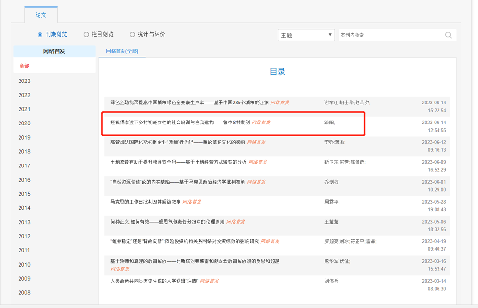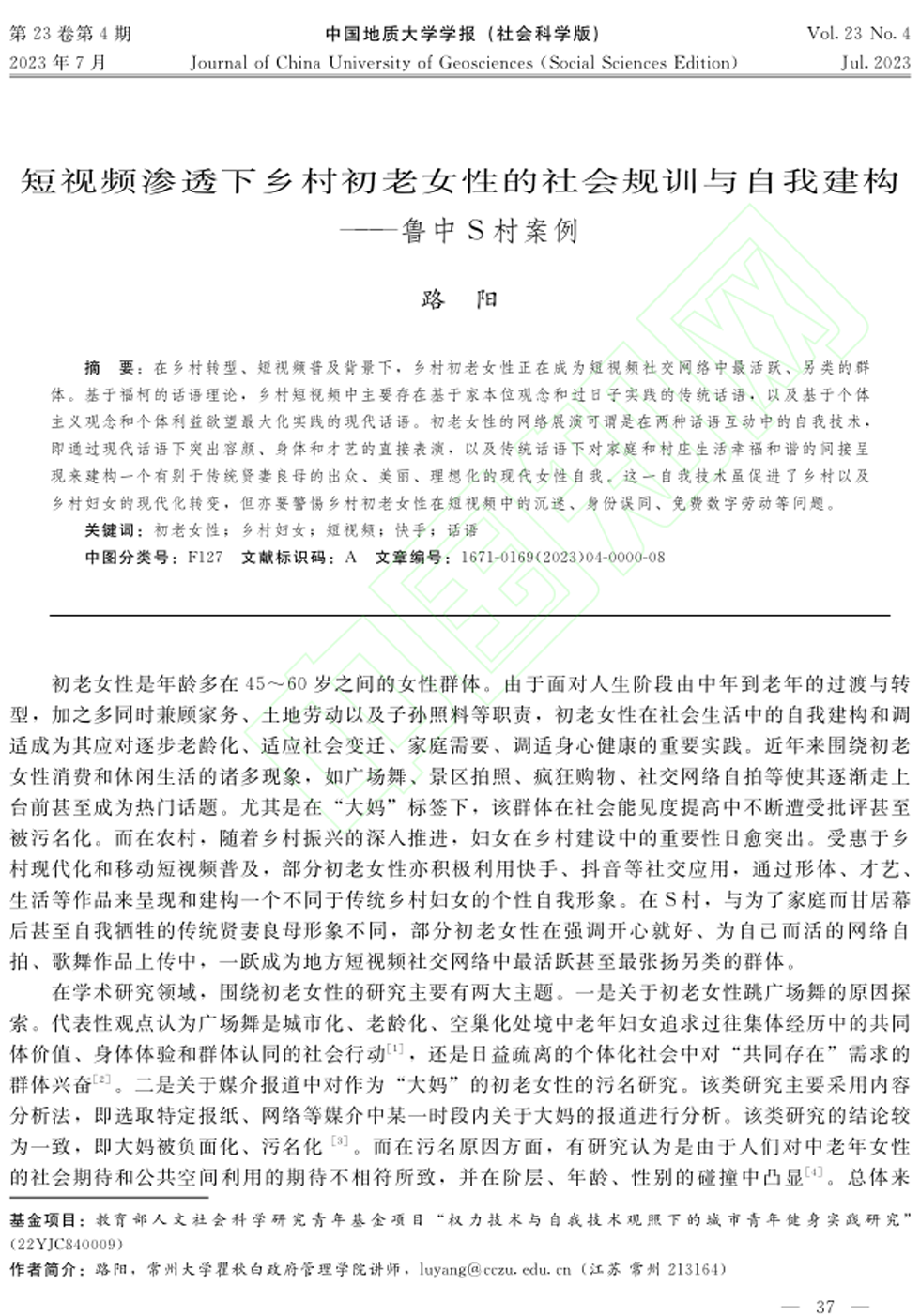 今日看料 青年教师路阳博士在《中国地质大学学报(社会科学版)》2023年第4期发表文章《短视频渗透下乡村初老女性的社会规训与自我建构——鲁中S村案例》(网络首发)。
