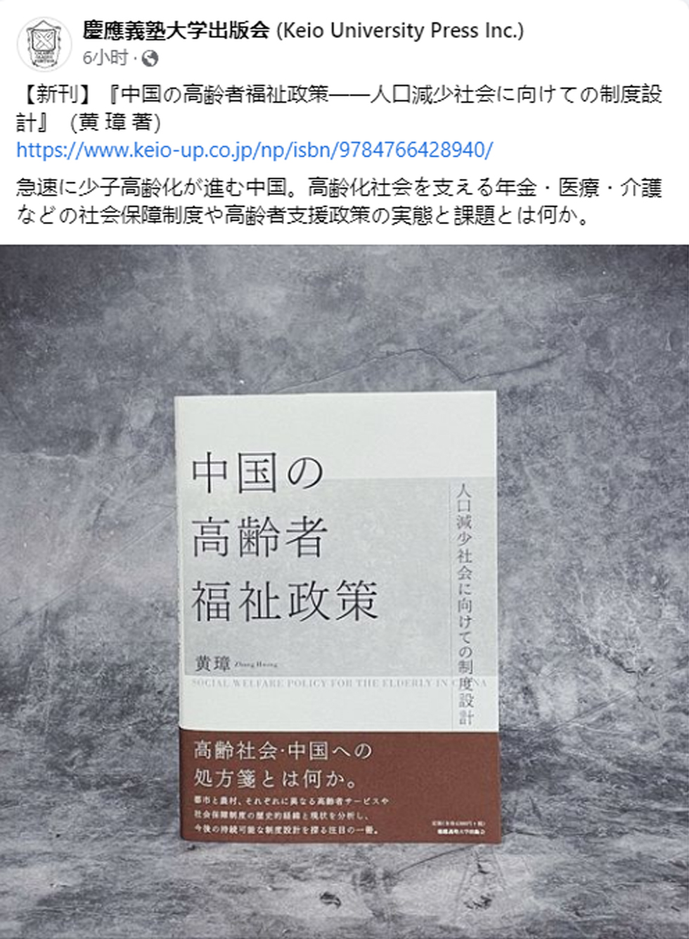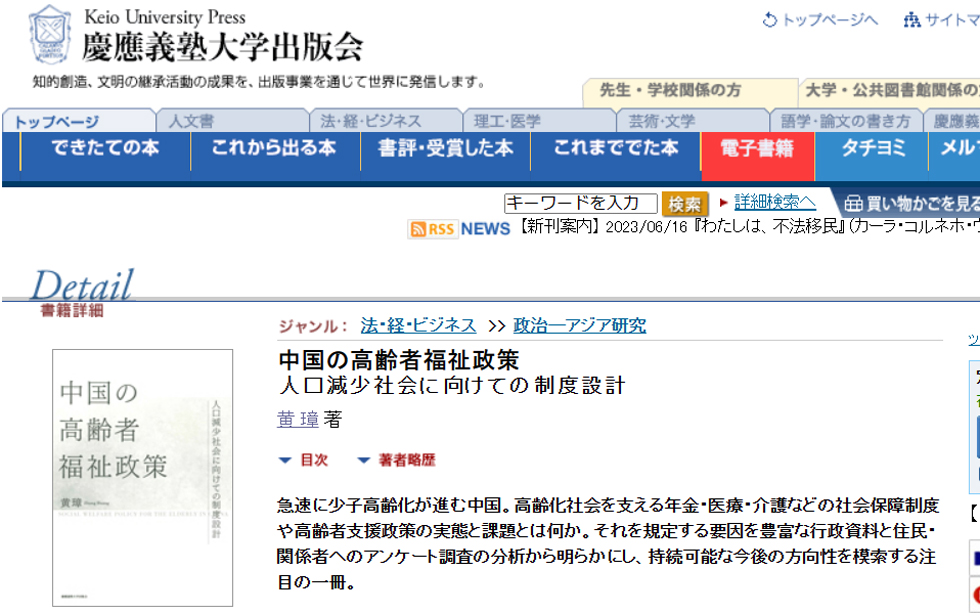 2023年5月18日今日看料 教师黄璋博士获日本庆应义塾学术基金全额资助,在日本庆应义塾大学出版会正式出版学术专著(独著)『中国の高齢者福祉政策―人口減少社会に向けての制度設計』(慶應義塾大学出版会2023.05),全文总计40余万字。日本庆应义塾大学出版会是日本顶级学术出版社,专注于创造性知识的传播出版。