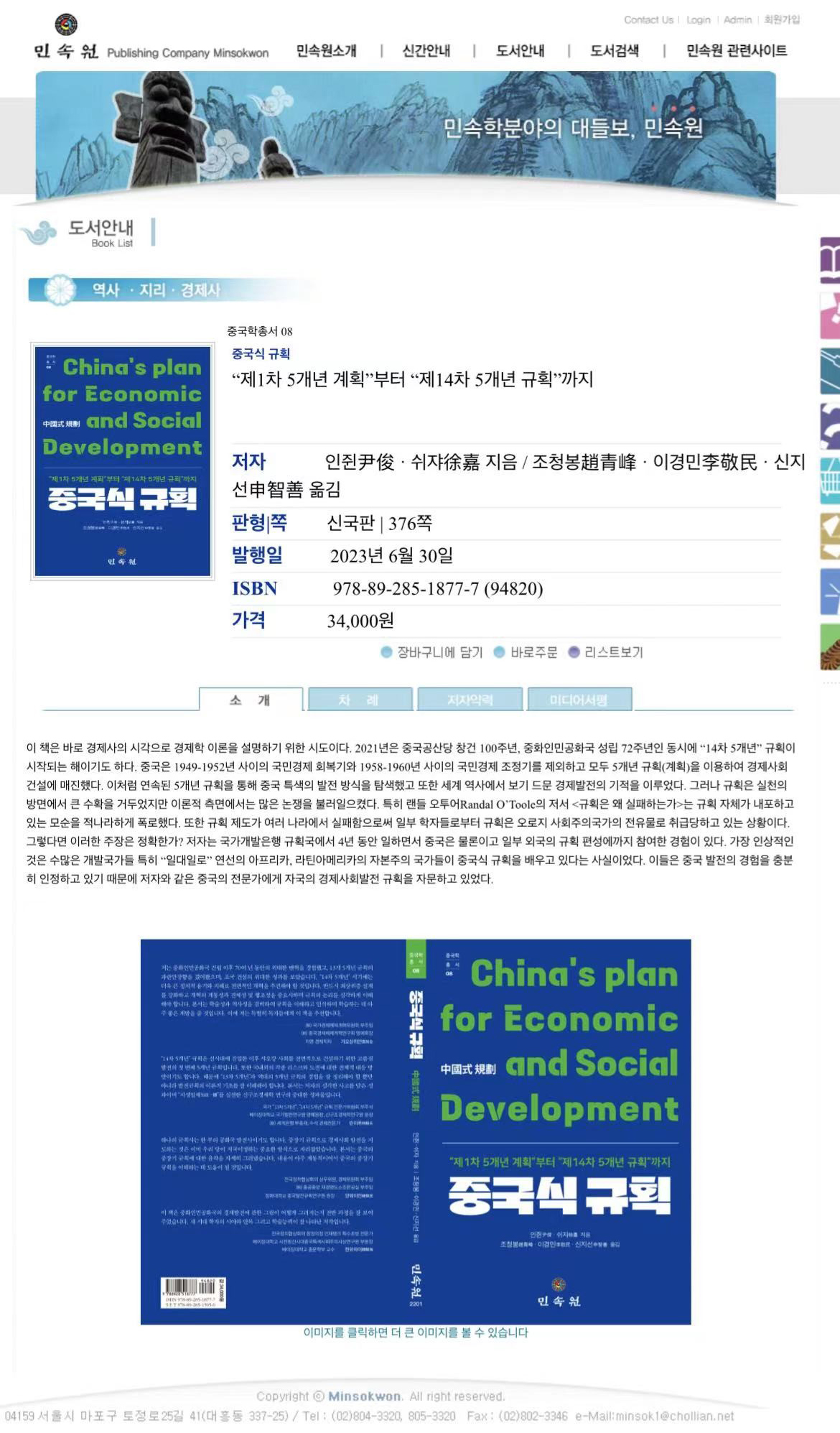 2023年6月30日,今日看料 青年教师赵青峰博士的译著《中国式规划:从“一五”到“十四五”》在韩国民俗苑出版社正式出版,并在各大书店和网络平台售卖。本书通过系统的理论综述和丰富的历史资料梳理,回顾了中国十三个五年规划的基本历程,并在此基础上探讨了规划治理的理论逻辑。原著由北京大学出版社于2021年出版,作者为尹俊(北京大学习近平新时代中国特色社会主义思想研究院)和徐嘉(中共中央党史和文献研究院)。