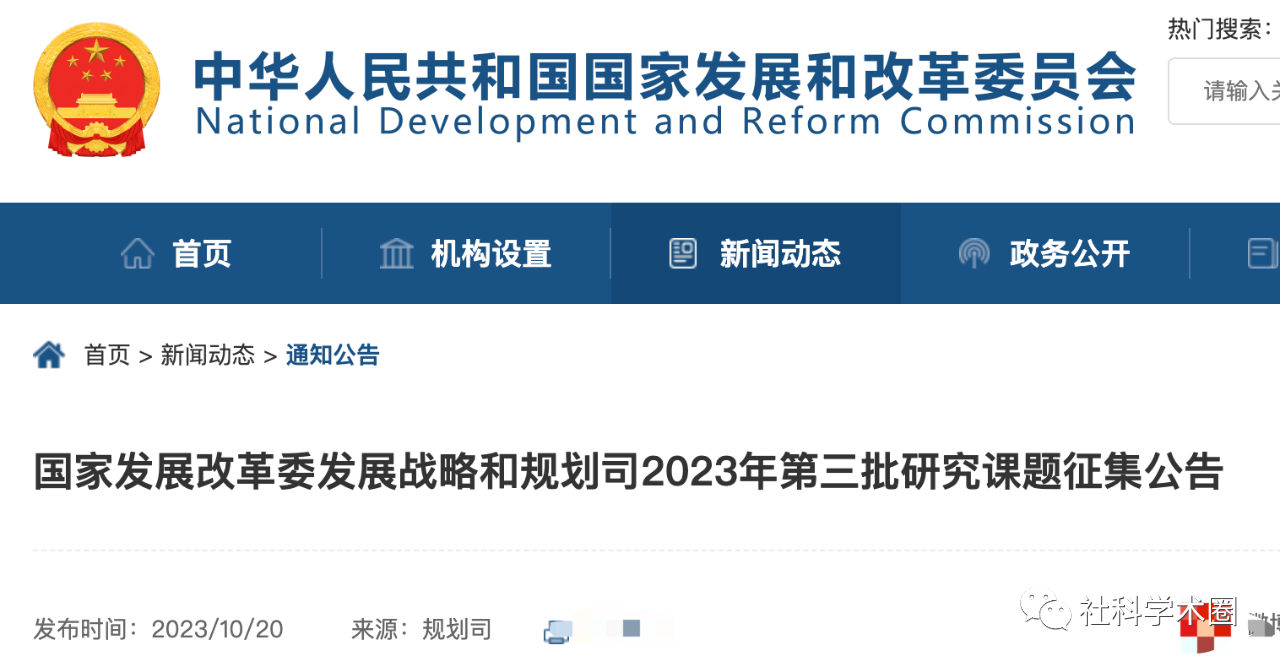 2023年10月20日,国家发改委网站发布了第三季度研究课题征集公告,启动了本季度的课题征集工作。