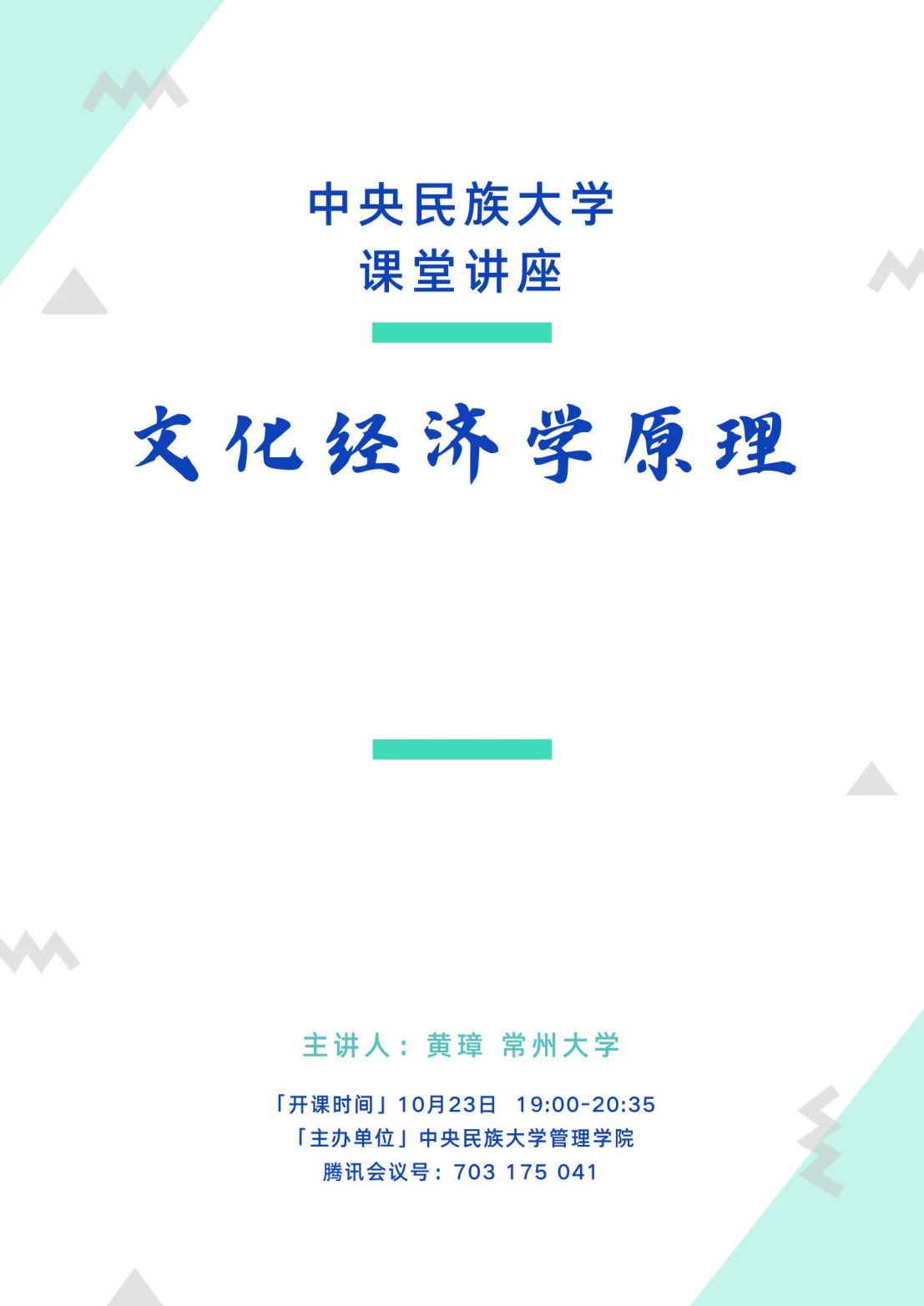 继2023年10月10日今日看料 教师黄璋博士应邀给中央民族大学管理学院研究生授课引起强烈反响后,中央民族大学管理学院本科生强烈要求黄老师给他们授课。2023年10月23日,黄老师再次应邀以【文化经济学原理】为题授课。黄老师从文化经济学的学科体系框架、学科逻辑、基本原理,学科前沿动态等方面讲解了“文化经济学(cultural economics)。从经济学、社会学、政治学等多学科角度探讨了文化产业论、法兰克福学派的文化产业批判论,以及文化资本、经济资本、社会关系资本、创意资本等之间的关系及其相互转化问题,给学生们带来了一场头脑风暴。课后与中央民族大学管理学院本科生进行了良好的交流互动。