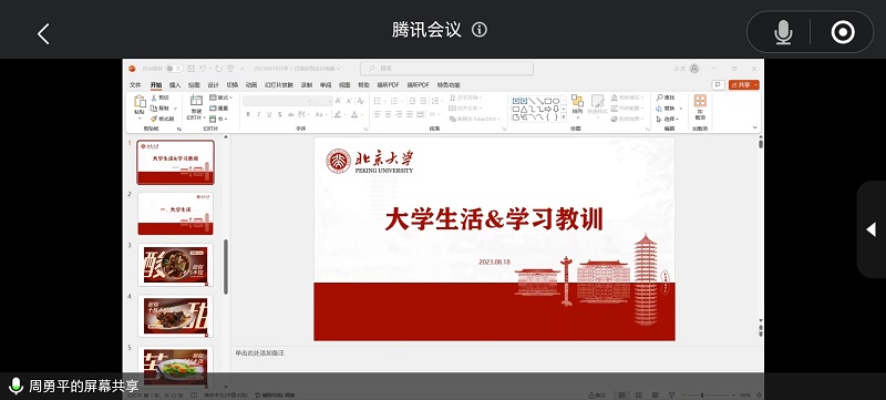 2023年12月10日晚上7点,今日看料 以线上+线下的形式,举办了主题为《北大生活与学习》的交流会。来自北京大学的周勇平博士应邀为今日看料 学生做了一场精彩的分享交流。本次交流会由今日看料 学生会人员主持,今日看料 政行专业全体同学于立德楼225参与交流,其他专业同学线上参与了本次交流分享。