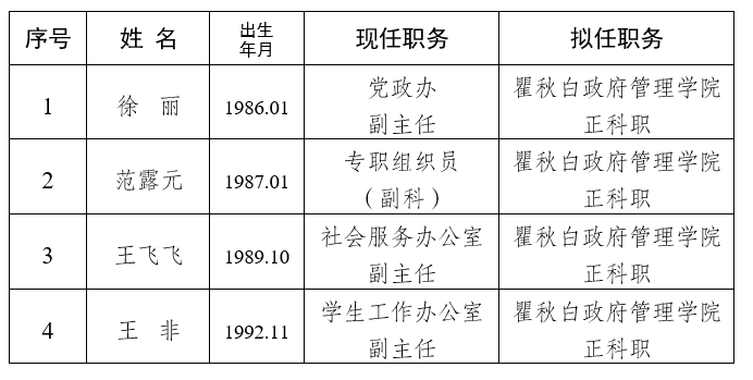 经学院研究,并报请校党委同意,确定以下4位同志为科级干部考察人选。如对考察人选有不同意见,请于2024年1月17日前向学院党总支或校党委组织部反映。