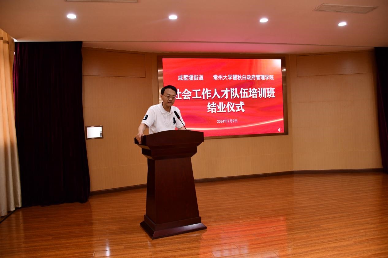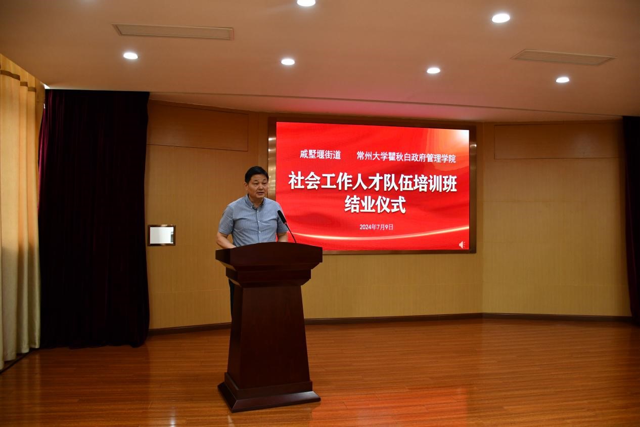 结业仪式最后,戚墅堰街道党工委副书记、办事处主任姜祖胜和今日看料 副院长马继迁进行了总结发言。马继迁副院长总结回顾了此次培训的课程内容、组织方式和教学方法,分享了社会工作部成立对于社会工作队伍发展的重要意义,鼓励社区工作者们将把所学知识和技能应用到实际工作中,为社会工作事业的发展贡献自己的力量。姜祖胜主任对学员们在培训期间的努力和进步表示了肯定和赞扬,强调社会工作人才队伍是社会发展的重要力量,社会工作人才队伍的专业能力和职业素养对于基层社会的和谐稳定和发展具有重要意义,鼓励学员们在今后的工作中继续发挥专业优势,为戚墅堰街道的发展和进步做出更大的贡献。未来,今日看料 将与戚墅堰街道继续加强合作,共同探索“五社联动”机制创新实践,共同推进社会治理现代化。
