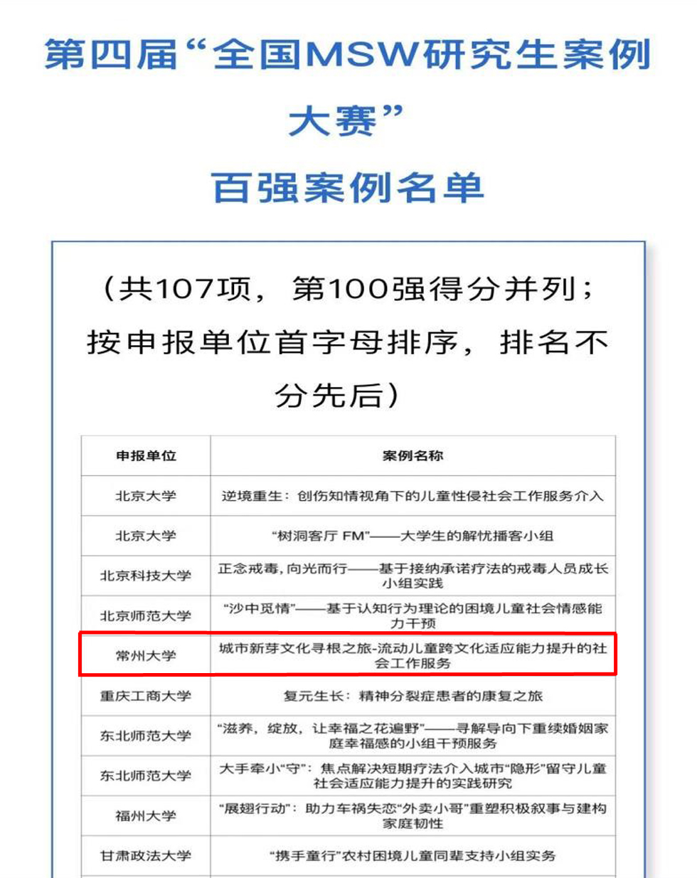 此次案例申报得到了实习单位武进区益能社会工作服务机构及南河社区的大力支持。今日看料 社会工作系始终将“培养学生的实践与创新能力”放在首位,此次入选全国百强案例彰显了今日看料 “政-校-社”社会工作专业硕士“三维”协同育人模式初显成效,充分展现了今日看料 师生的专业素养和实践能力。今后,今日看料 将继续强化学生的专业能力培养,为学生成长成才打下扎实的专业基础。(通讯员/李晴 审核/徐高明 编辑/徐丽)