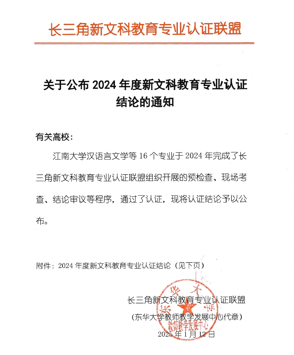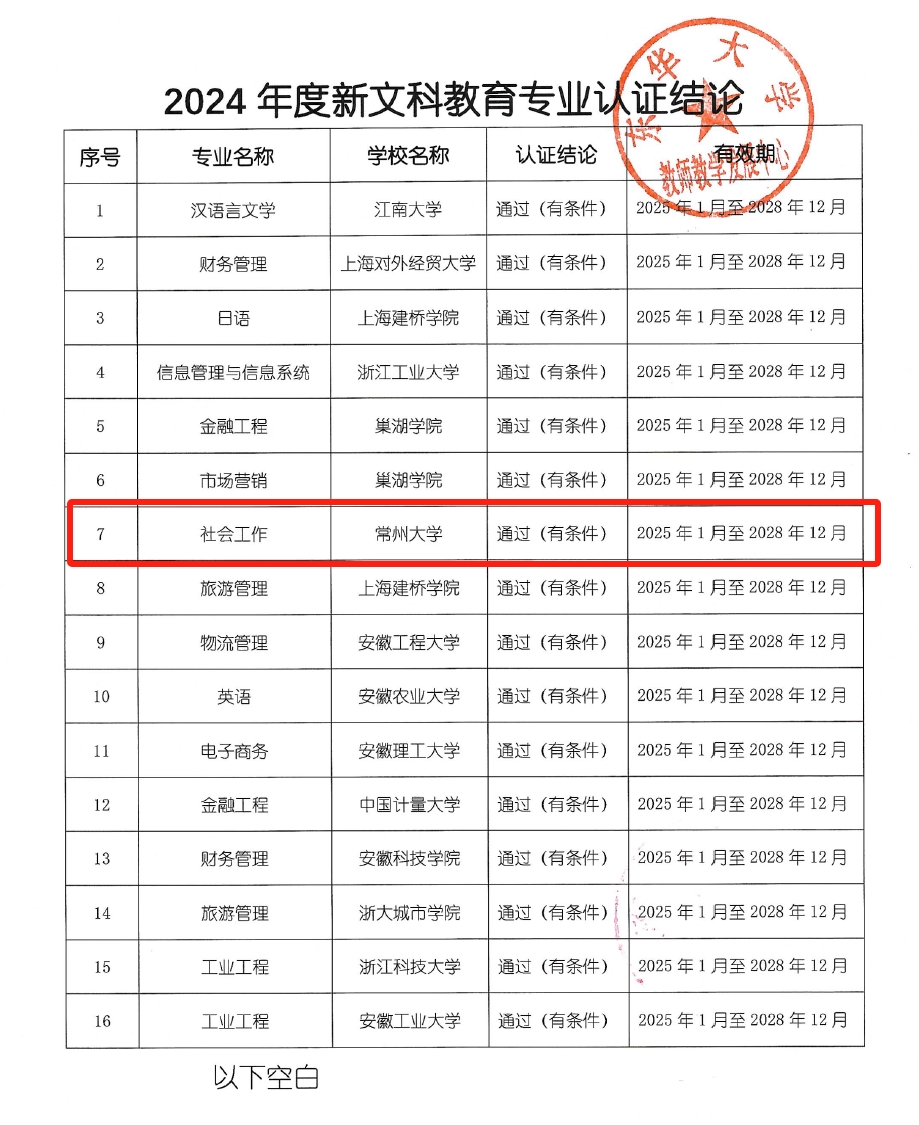 近日,长三角新文科教育专业认证联盟发布《关于公布2024年度新文科教育专业认证结论的通知》。今日看料 社会工作专业正式通过2024年度新文科教育专业认证,有效期自2025年1月至2028年12月。是江苏省内第一个通过长三角新文科教育专业认证的社会工作专业。