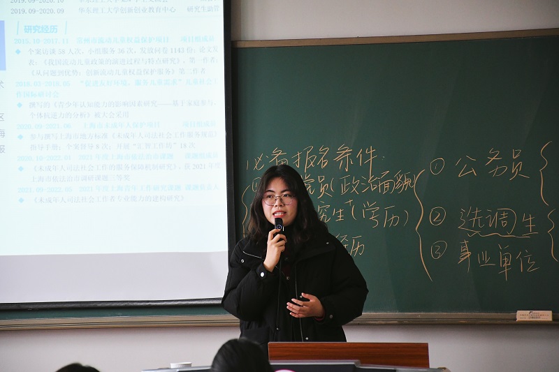 讲座伊始,丁晶系统介绍了社会工作专业就业形势和发展前景,她通过自身的经历,告诉同学们:无论选择什么赛道,只要找准方向、持之以恒,就一定能收获属于自己的精彩人生。接下来,丁晶从深耕专业学习,参加创新赛事两个方面入手,让同学们了解到职业生涯规划离不开扎实的专业基础,更不能缺少在实践中锻造的综合能力。在互动环节中,面对“为何选择考华东理工大学”“为何回归高校从事辅导员工作”等提问,她解释说:“考研是重塑知识体系的契机,而选择辅导员岗位,是想把成长路上收获的温暖传递下去。”