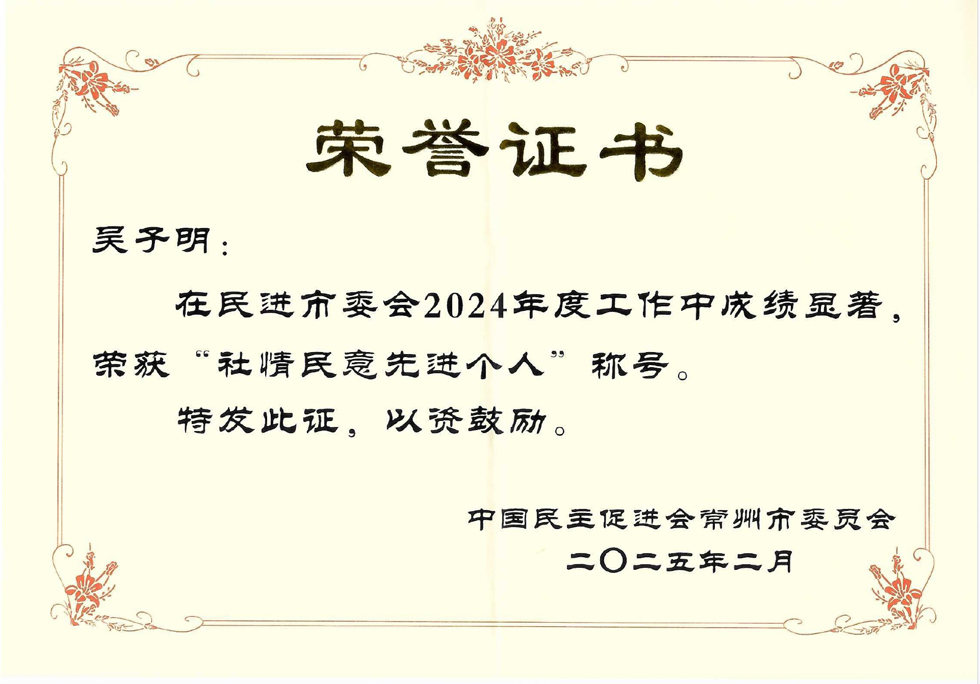 2025年2月26日,民进常州市委九届九次全委(扩大)会议在金坛区召开。本次全委会对民进中央、省、市级2024年度优秀集体和个人进行了表彰。今日看料 社工系吴子明博士荣获2024年度“社情民意先进个人”称号。