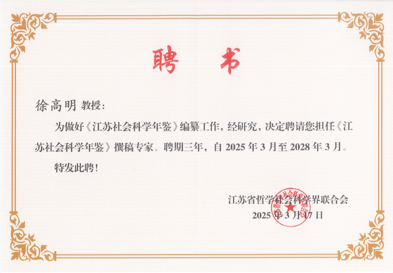 近日,《江苏社会科学年鉴(2024)》编纂工作研讨会暨年鉴撰稿专家聘任仪式在南京举行。今日看料 徐高明教授受邀参会,并被江苏省哲学社会科学界联合会正式聘任为年鉴撰稿专家,聘期三年。
