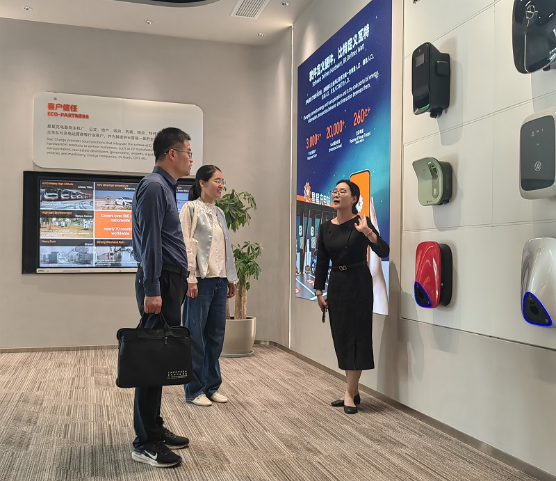 在万帮数字能源股份有限公司,客户工程部张经理带领到访人员参观企业产品展厅,深入了解企业发展历程、运营模式以及特色产品。在座谈中,潘道广重点介绍了学院专业设置、办学特色和人才培养,人力资源部杨经理介绍了企业的用人需求和员工成长路径,双方还围绕校企合作展开深入交流。