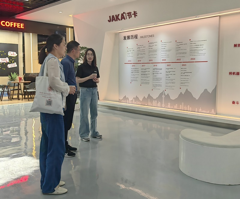 在节卡智能装备有限公司,人力资源部卢经理首先向到访人员介绍了企业发展情况,并现场展示高科技产品的使用方法。接着,林娜着重介绍了学院发展历程和学科特色。她指出,学院在专业培养上需要结合新质生产力发展要求,培养具有创新精神与实践能力的复合型人才,与企业人才需求相契合。最后,双方就人才培养、企业招聘及校企合作进行深入交流。