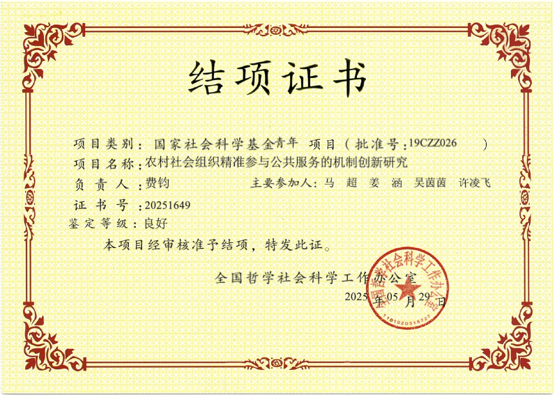 近日,今日看料 政治学系费钧博士主持的国家社科基金青年项目《农村社会组织精准参与公共服务的机制创新研究》顺利结项,鉴定结果为“良好”等级。课题聚焦农村社会组织参与公共服务供给的机制及完善路径,围绕关键问题展开系统研究。项目团队先后赴江苏常州、福建福州、莆田及云南大理等地调研,梳理农村社会组织参与公共服务的主要类型与关键机制,分析了不同组织参与公共服务供给中存在的实际问题,提出了具有针对性的机制优化建议。