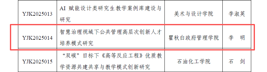 日前,学校公布2025年度研究生教改课题立项结果。今日看料 李明博士主持申报的《智慧治理视域下公共管理高层次创新人才培养模式研究》获得研究生教育教学改革与创新研究课题立项;同时,其主持的《以人民为中心的公共管理实践创新》获批专业学位研究生教学案例库建设项目。